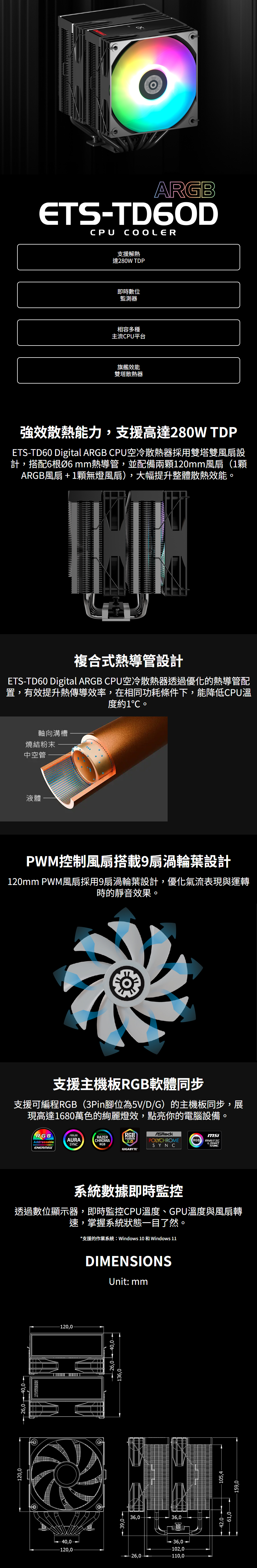 保銳 ETS-TD60D ARGB 散熱器/6導管/高15.9/數位監控/雙塔雙扇/全黑化/TDP:280